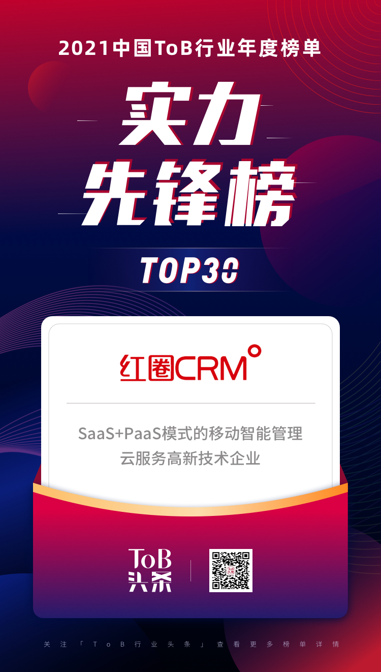 12月27日,「ToB行業頭條」聯手3W集團正式發布了《2021ToB行業年度榜單·實力先鋒榜》,評選出了2021年ToB領域各賽道最具實力的先鋒企業TOP30?!昂蛣摽萍迹?strong>紅圈CRM)”作為數字化智能企業云服務領域的先鋒企業,入選榜單行列!