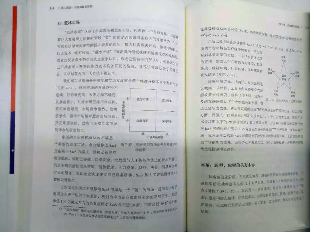 我們可以從市場開拓難度和市場發展前景兩個維度分析不同類型的市場。混沌市場的發展路徑不連續,開拓難度高,未來方向不確定,發展前景小;紅海市場已經相當成熟,開拓難度最低,市場競爭激烈,發展前景小;藍海市場相對藍冰市場而言,開發難度較低,藍海市場和藍冰市場同樣市場前景較大。