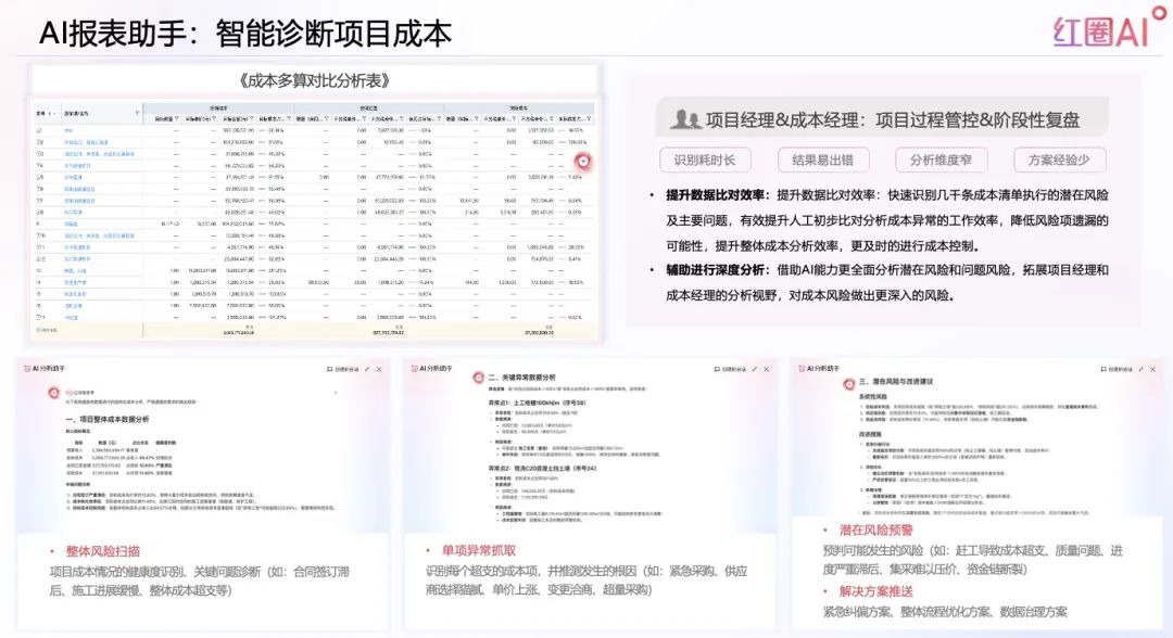 ? 深度分析潛在風險:結合紅圈系統的全流程數據,AI報表助手不僅能識別項目的健康狀況,還能深入分析如合同滯后、施工延誤等潛在風險,為項目經理提供更加全面的成本管控視角。