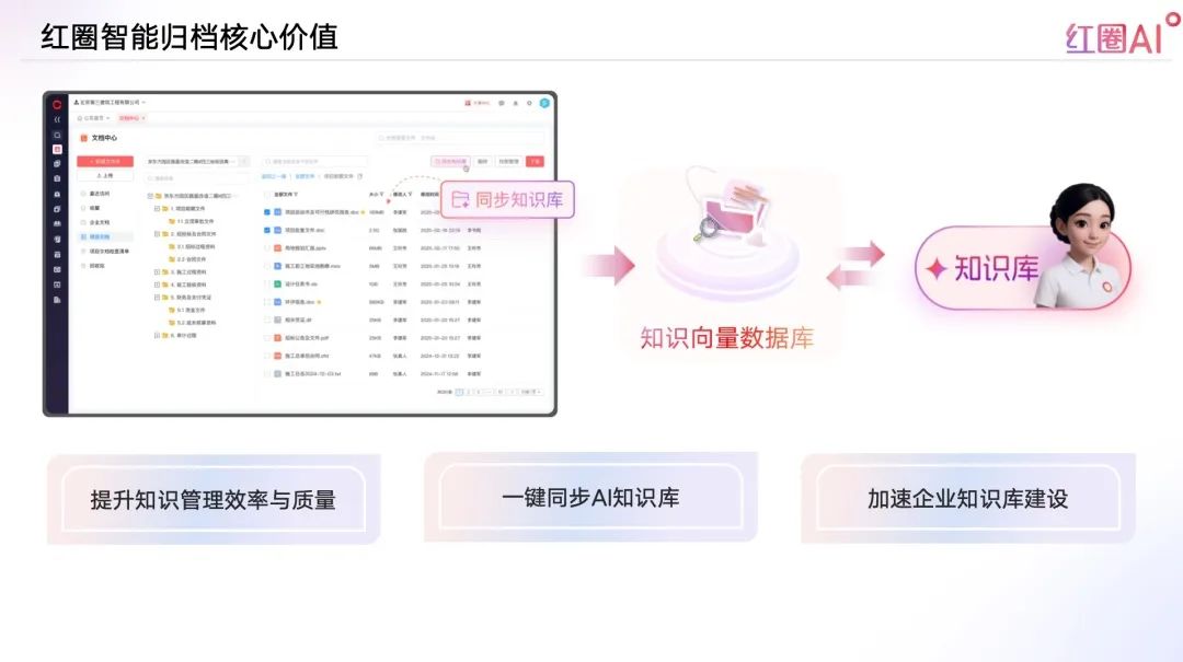 企業在經驗傳承上往往面臨資料分散、查找困難、更新滯后等難題。紅圈AI通過構建知識向量數據庫,將分散在文檔、郵件、制度、系統中的“碎片知識”智能歸集,并支持自然語言提問,3秒獲取精準答案,真正實現“人人皆可答,事事有依據”。