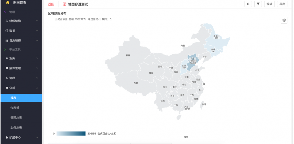 - 地圖可設置默認顯示區域,區域可進行向下鉆取,如點擊北京市,可查看北京各區的數據。每個區域的顏色代表數值的大小,顏色越深數值越大