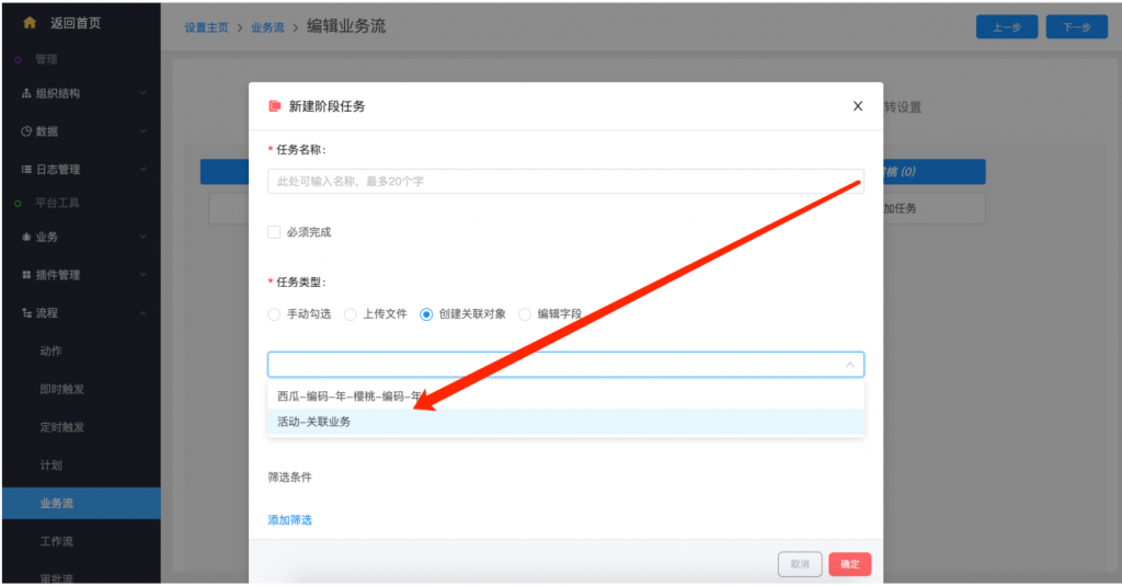 - 業務流創建關聯對象類型的任務,支持活動對象