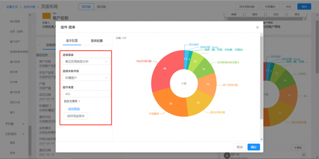 - 分析組件:選擇圖表和報表,拖入右側(cè)頁面區(qū)域進行配置