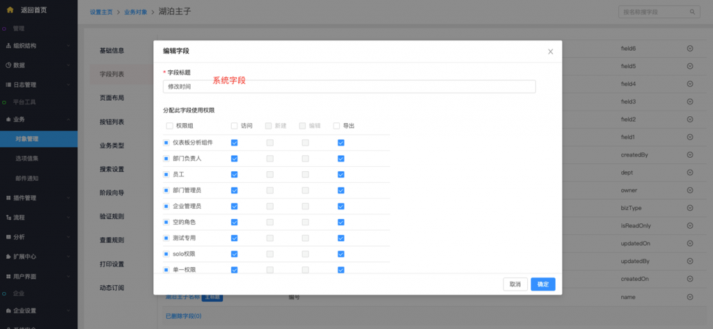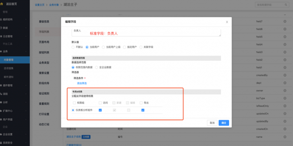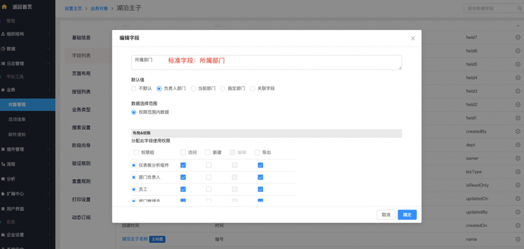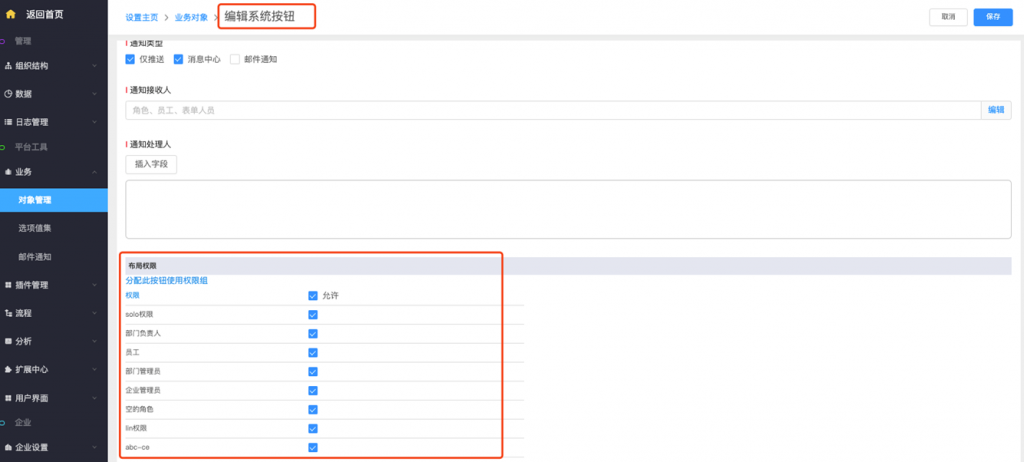 - 系統(tǒng)字段及按鈕修改權(quán)限配置:系統(tǒng)字段、標準字段(所屬部門及負責(zé)人)、按鈕支持在編輯時修改權(quán)限