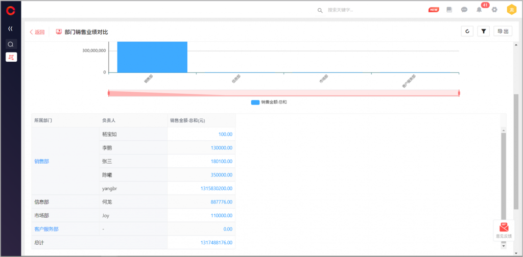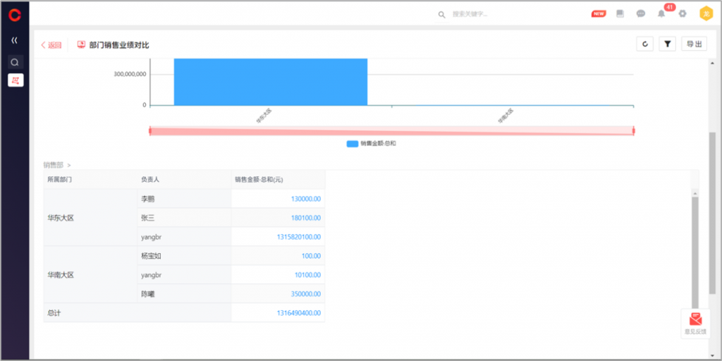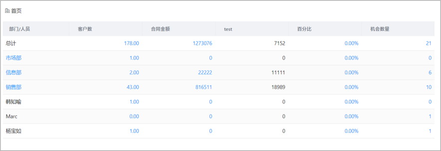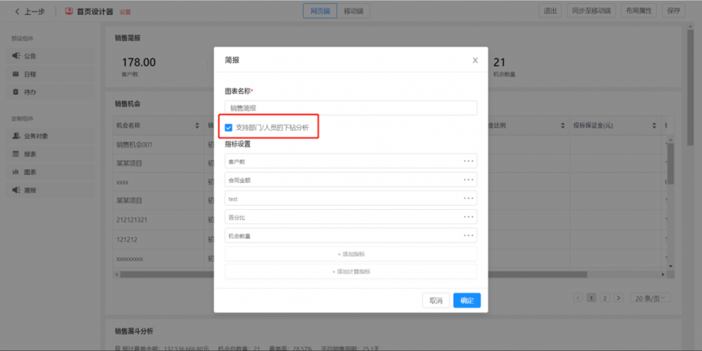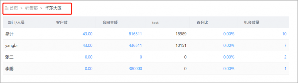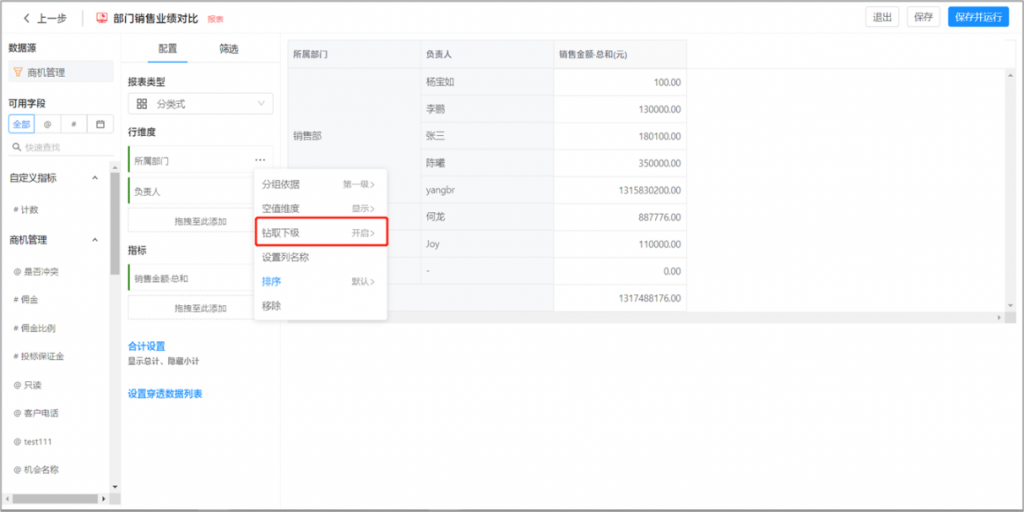 自定義報(bào)表支持部門下鉆:當(dāng)以部門為維度時(shí),可開啟部門下鉆,逐級(jí)查看下級(jí)部門的分析數(shù)據(jù)