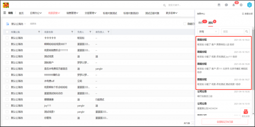 線索池、客戶池管理員分配數(shù)據(jù)后,系統(tǒng)會(huì)給新負(fù)責(zé)人發(fā)通知提醒