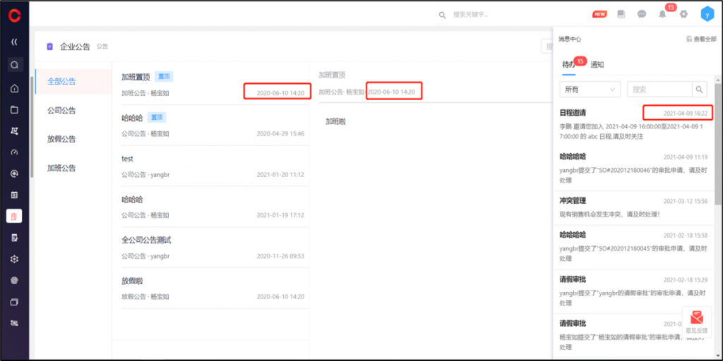 通知、待辦、公告、動(dòng)態(tài)、審批流歷史中的時(shí)間顯示完整時(shí)間,如2021-05-21 10:11,時(shí)間留痕更嚴(yán)謹(jǐn)。