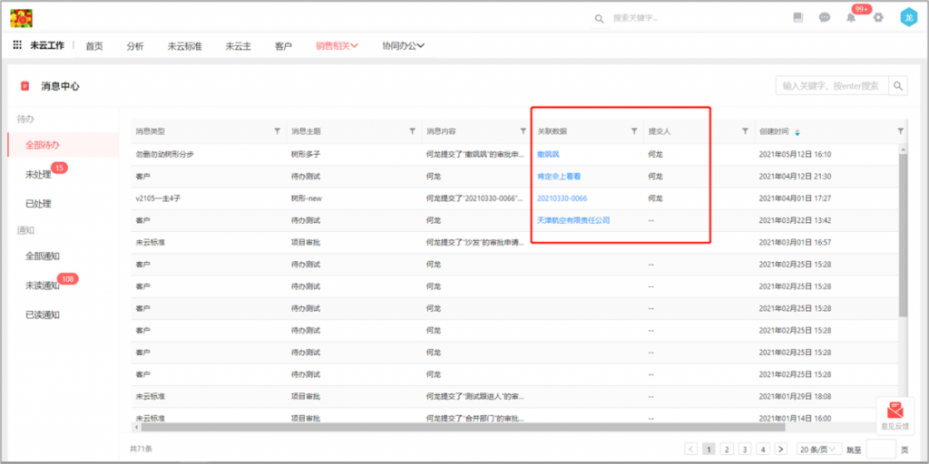web端待辦顯示提交人和關(guān)聯(lián)數(shù)據(jù)標(biāo)題:web端消息中心,待辦消息中增加提交人和關(guān)聯(lián)數(shù)據(jù)的信息顯示
