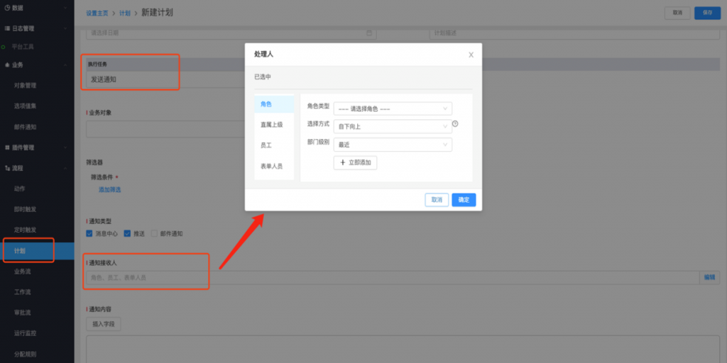 計(jì)劃的通知接收人選人組件優(yōu)化:計(jì)劃的通知接收人選人組件支持按角色、直接上級(jí)、員工、表單人員的維度