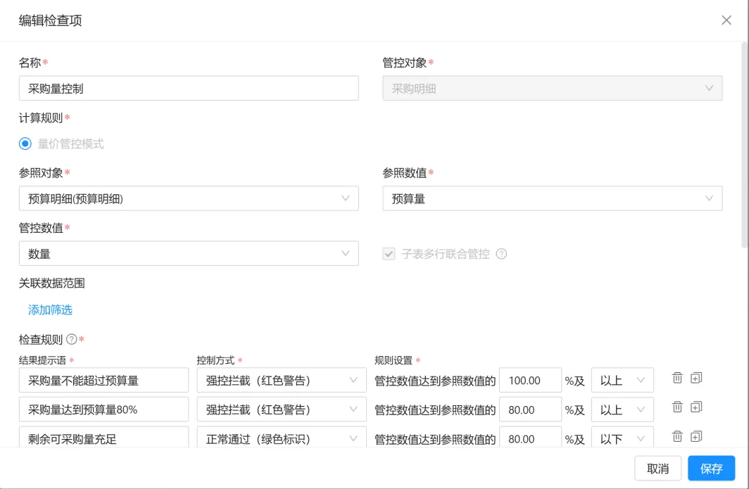 增加對于子對象的管控能力,主要用于支持自主搭建的“預算→申請→支付或領用”量價管控類場景,并且可以做到子表多行聯合管控,解決原有驗證規則無法支持的問題