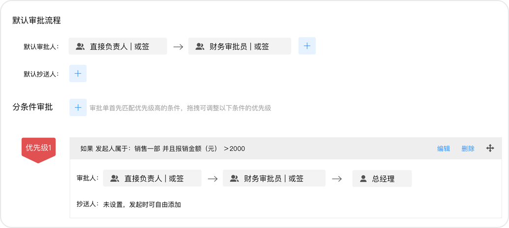 小王這次要報銷2500元的出差費用,而公司規定報銷超出2000元就需要總經理進行額外審批。這種情況可以通過設置“分條件審批”功能來實現,將報銷金額是否大于2000作為判斷應該走哪一條流程的條件:1)金額小于等于2000元時,流程按“直接負責人-財務審核員”執行;2)金額大于2000元時,流程按“直接負責人-財務審核員-總經理”執行。分條件審批不僅可以設置按金額判斷,還可以設置按發起人部門、報銷類型等判斷。