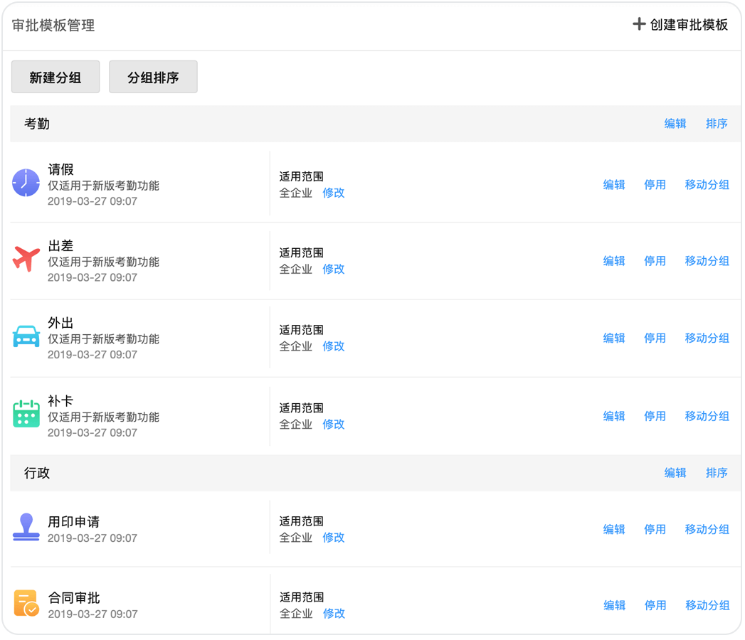 企業可以通過自定義審批類別和模板來規范審批的格式,并為所有審批進行分組、排序,讓審批管理和使用都更加便捷。