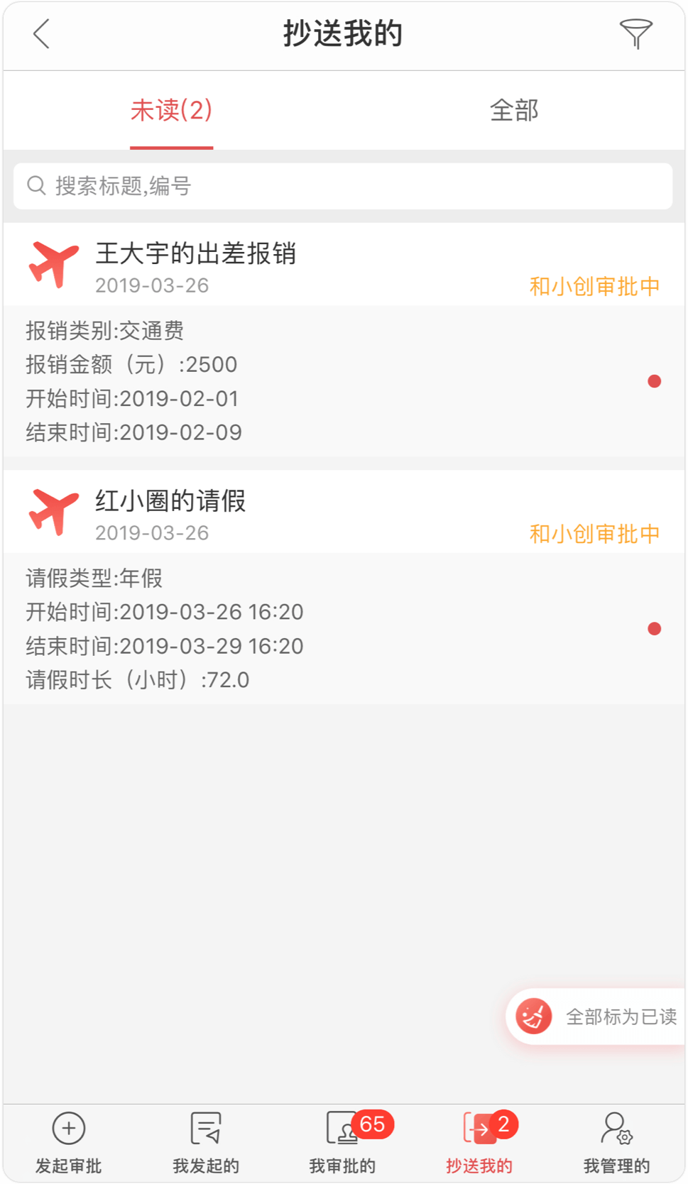 審批列表中的信息可按規律配置透出信息;抄送列表增加未讀狀態,并可一鍵全部已讀;審批詳情頁信息展示更友好、高效。