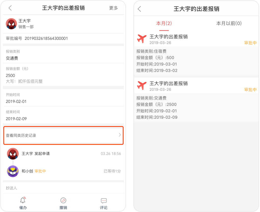 審批人可以查看發起人同類審批的歷史情況。比如報銷審批時,可以看該員工本月或之前已經發起了幾次報銷申請。