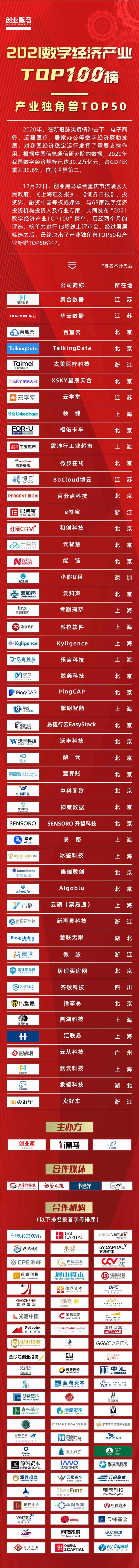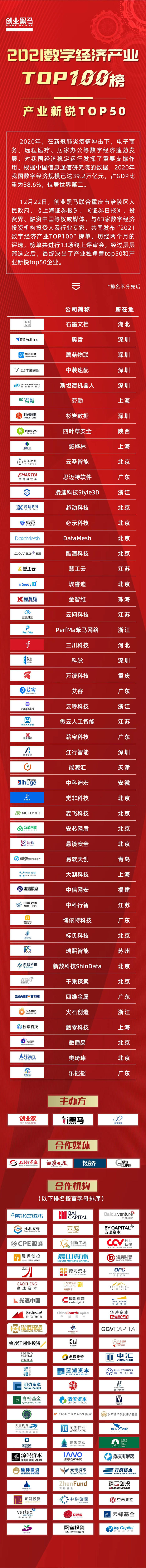 基于此,12月22日創業黑馬聯合重慶市涪陵區人民政府、《上海證券報》、《證券日報》、投資界、融資中國等權威媒體,與63家數字經濟投資機構投資人及行業專家,共同發布“2021數字經濟產業TOP100”榜單。