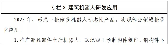 積極推進建筑機器人在生產、施工、維保等環(huán)節(jié)的典型應用,重點推進與裝配式建筑相配套的建筑機器人應用,輔助和替代“危、繁、臟、重”施工作業(yè)。
