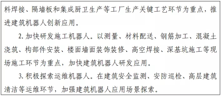 推動在材料配送、鋼筋加工、噴涂、鋪貼地磚、安裝隔墻板、高空焊接等現(xiàn)場施工環(huán)節(jié),加強建筑機器人和智能控制造樓機等一體化施工設備的應用。