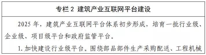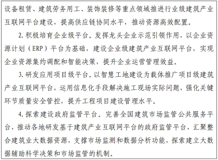 開展建筑產業(yè)互聯(lián)網平臺建設試點,培育一批行業(yè)級、企業(yè)級、項目級建筑產業(yè)互聯(lián)網平臺,建設政府監(jiān)管平臺。