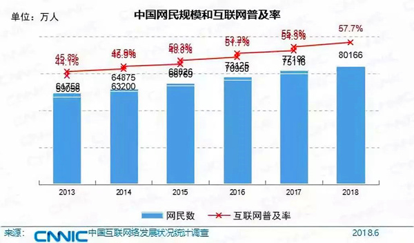 截至2018年6月,我國(guó)網(wǎng)民規(guī)模為8.02億,上半年新增網(wǎng)民2968萬(wàn)人,較2017年末增加3.8%,互聯(lián)網(wǎng)普及率達(dá)57.7%。