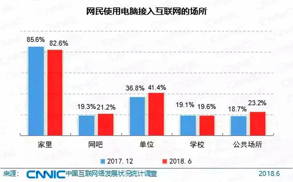 同樣,我國(guó)網(wǎng)民在家里通過(guò)電腦接入互聯(lián)網(wǎng)的比例為82.6%,與2017年末相比降低了3.0個(gè)百分點(diǎn);在網(wǎng)吧、單位、學(xué)校、公共場(chǎng)所通過(guò)電腦接入互聯(lián)網(wǎng)的比例分別增長(zhǎng)了2.0、4.6、0.5、4.5個(gè)百分點(diǎn)。在上網(wǎng)時(shí)長(zhǎng)方面,2018年6月,中國(guó)網(wǎng)民的人均周上網(wǎng)時(shí)長(zhǎng)為27.7小時(shí),相比2017年末提高0.7個(gè)小時(shí)。