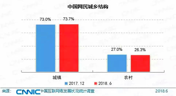 截至2018年6月,我國(guó)農(nóng)村網(wǎng)民規(guī)模為2.11億,占整體網(wǎng)民的26.3%,較2017年末增加204萬(wàn)人,增幅為1.0%;城鎮(zhèn)網(wǎng)民規(guī)模為5.91億,占比達(dá)73.7%,較2017年末增加2764萬(wàn)人,增幅為4.9%。我國(guó)不斷推進(jìn)城鎮(zhèn)化進(jìn)程,使得城鎮(zhèn)人口不斷增加,農(nóng)村人口不斷減少,城鄉(xiāng)網(wǎng)民結(jié)構(gòu)受此影響也發(fā)生了細(xì)微變化。