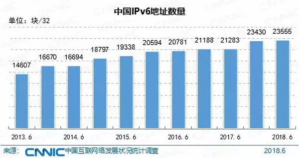 截至2018年6月,我國(guó)IPv6地址數(shù)量為23555塊/32,半年增長(zhǎng)0.53%。