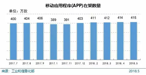 截至2018年5月,我國(guó)市場(chǎng)上監(jiān)測(cè)到的移動(dòng)應(yīng)用程序(app)在架數(shù)量為415萬(wàn)款。
