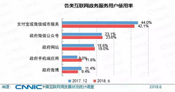截至2018年6月,我國(guó)在線政務(wù)服務(wù)用戶(hù)規(guī)模達(dá)到4.70億,占總體網(wǎng)民的58.6%,有42.1%的網(wǎng)民通過(guò)支付寶或微信城市服務(wù)平臺(tái)獲得政務(wù)服務(wù)。