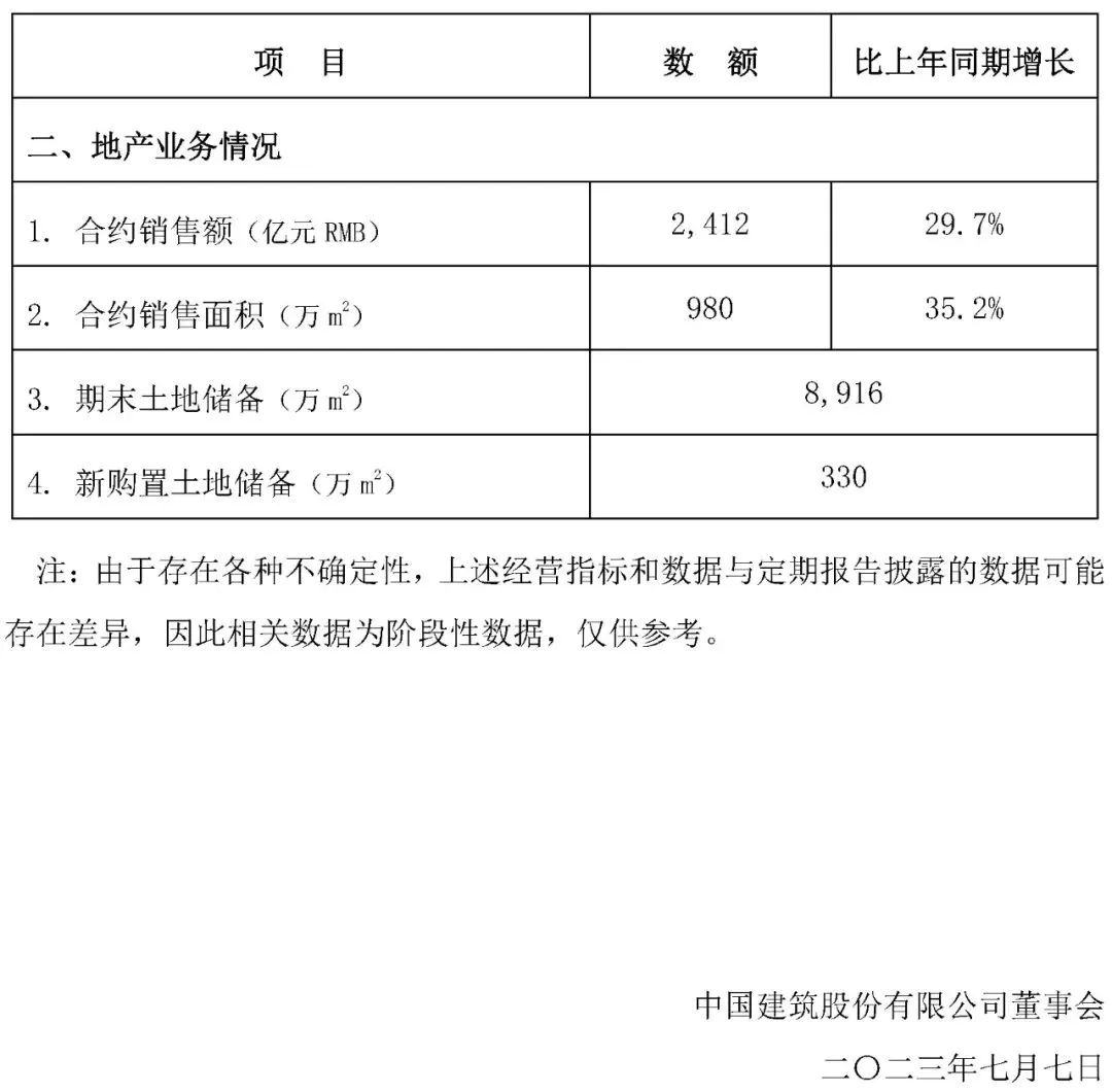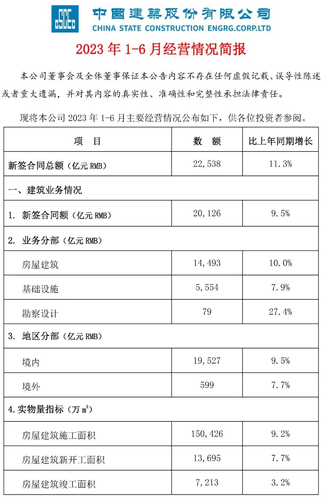 導讀:7月8日,中國建筑發(fā)布了《中國建筑2023年1-6月經(jīng)營情況簡報》。根據(jù)公告顯示,中國建筑2023年前6個月累計實現(xiàn)新簽合同額22538億元,同比增長11.3%。