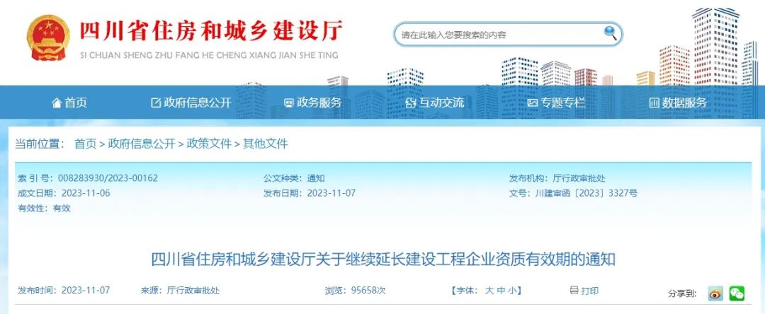 11月7日,四川省住房和城鄉建設廳發布關于繼續延長建設工程企業資質有效期的通知。