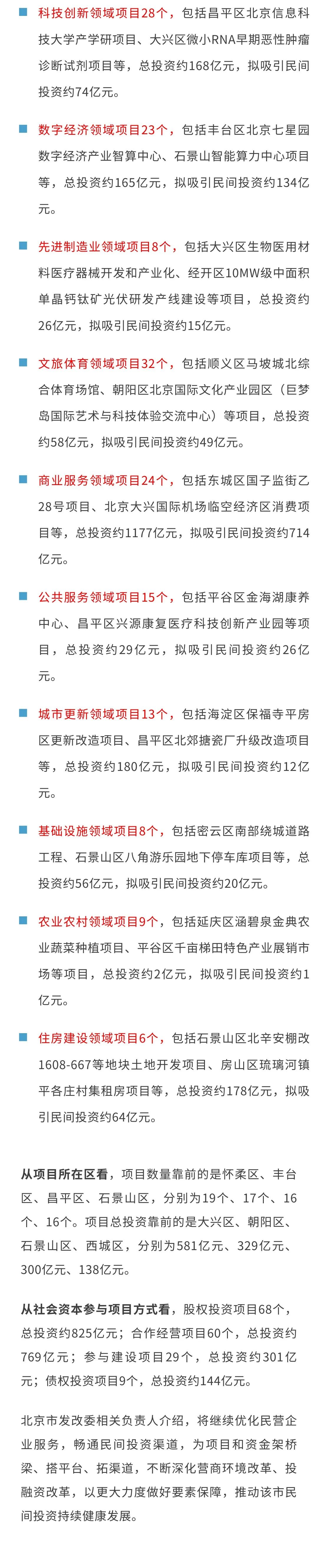 這一批項目是北京市發(fā)展改革委會同各區(qū)、各部門梳理篩選而出,符合首都城市功能定位、投資回報機制明確、有一定投資需求,涉及科技創(chuàng)新、數(shù)字經(jīng)濟、先進制造業(yè)等十大領(lǐng)域。
