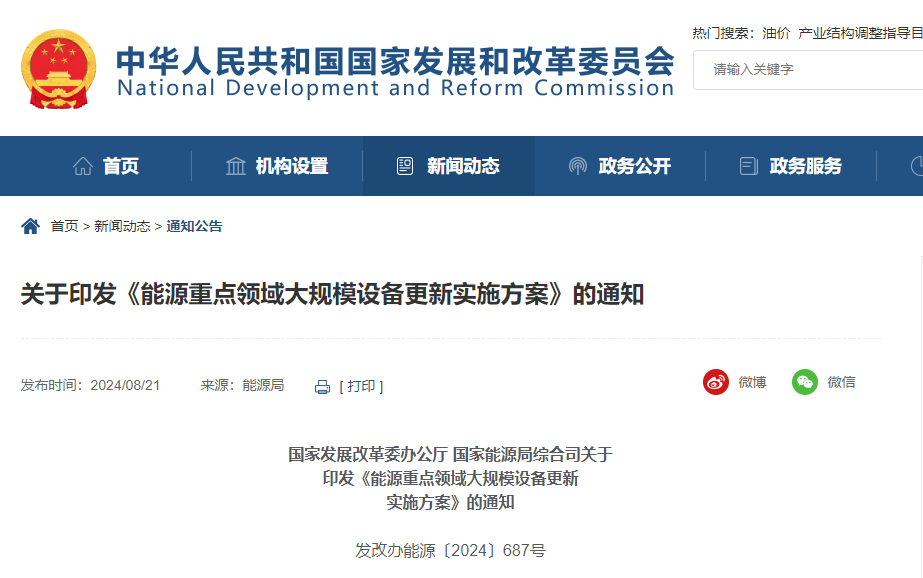 為貫徹落實國務(wù)院《推動大規(guī)模設(shè)備更新和消費品以舊換新行動方案》(國發(fā)〔2024〕7號),推動能源重點領(lǐng)域大規(guī)模設(shè)備更新和技術(shù)改造,國家發(fā)展改革委、國家能源局組織編制了《能源重點領(lǐng)域大規(guī)模設(shè)備更新實施方案》。現(xiàn)印發(fā)給你們,請認(rèn)真組織實施。