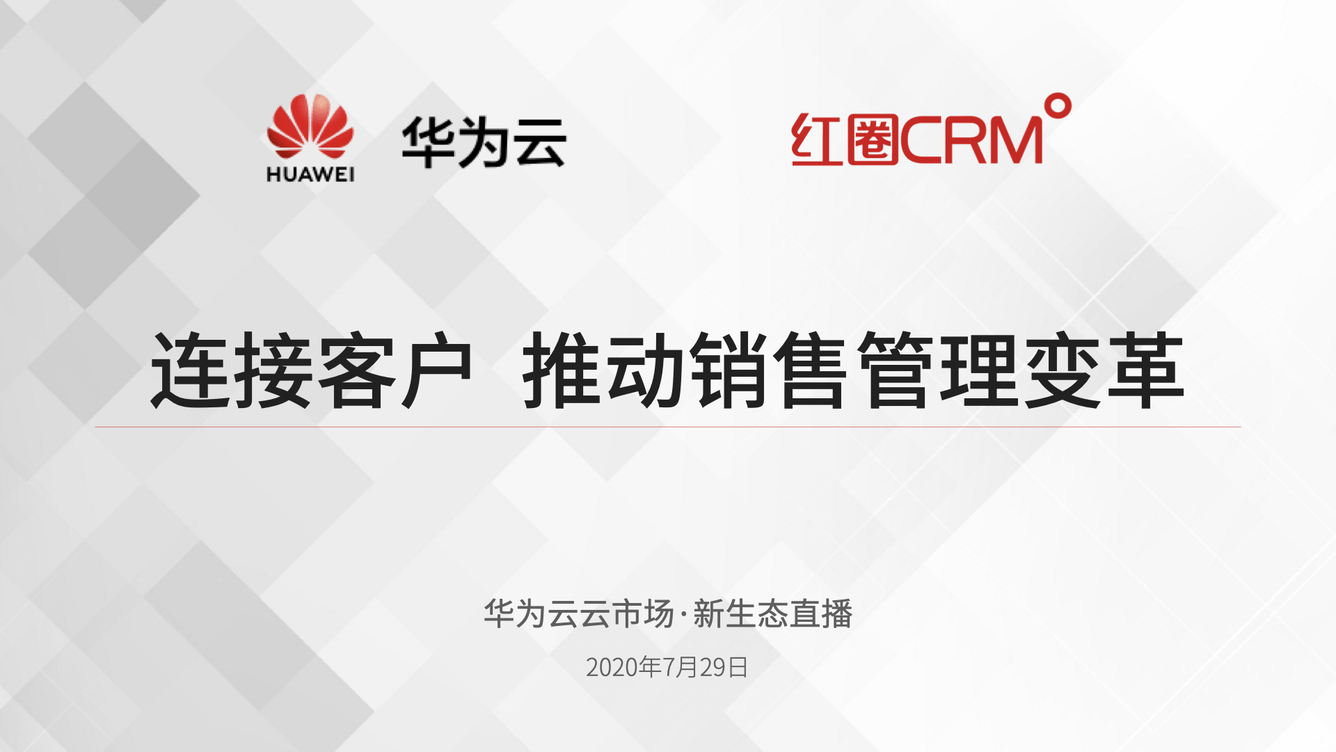 7月29日周三 15:00,紅圈聯(lián)合創(chuàng)始人兼 SVP 牛其建將在華為云云市場·新生態(tài)直播間為大家?guī)硪粓鼍实闹黝}分享——《連接客戶 推動(dòng)銷售管理變革》,歡迎廣大朋友屆時(shí)前來觀看直播,一同探討企業(yè)數(shù)字智能轉(zhuǎn)型升級之道。