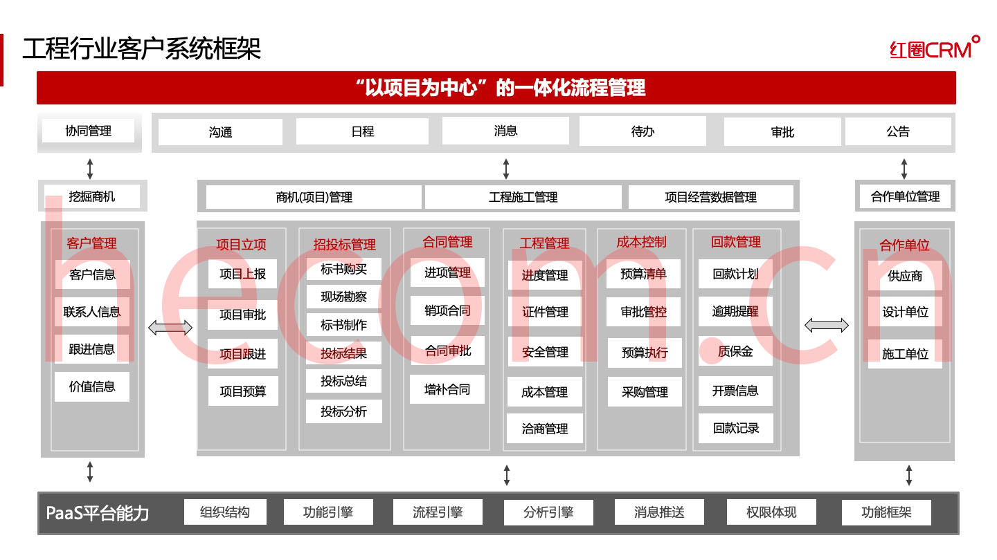 隨著市場經(jīng)濟的高速發(fā)展,企業(yè)間的競爭日趨激烈,深受政策影響的建筑工程企業(yè)也不例外,強化項目過程精細化管理,已經(jīng)成為建筑工程企業(yè)提升競爭力的重要途徑。紅圈借助互聯(lián)網(wǎng)、云計算、移動大數(shù)據(jù)等技術(shù),基于自主研發(fā)的紅圈 PaaS 平臺推出了紅圈 CRM 建筑工程項目管理系統(tǒng),幫助建筑工程企業(yè)進行業(yè)務流程梳理,打造以項目為中心的移動管理平臺,從而助力建筑工程企業(yè)在日益激烈的競爭中處于領先優(yōu)勢。紅圈 CRM 建筑工程項目管理系統(tǒng)適用于房建工程、市政工程、地基工程、水利工程、園林工程、環(huán)保工程、電力工程、道路工程等行業(yè)企業(yè)。